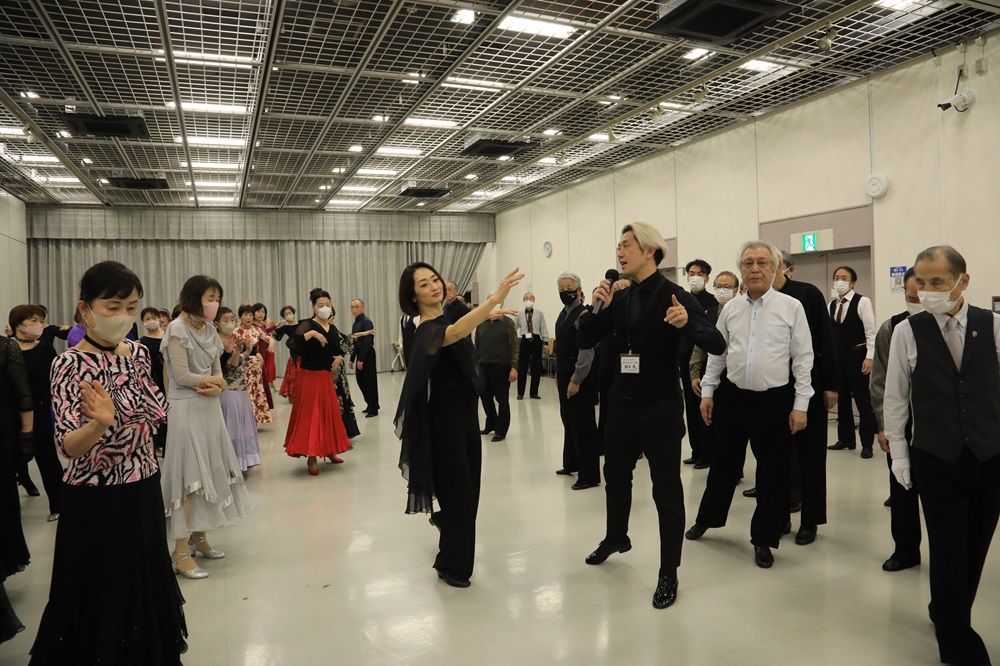 令和6年2月4日横浜市技能文化会館で今年最初の市民ダンス交流会を開催しました。 90名ものダンス愛好家の方々がフリーダンスタイム、ミキシングダンスタイムで汗を流し、お楽しみ講習会では元JBDFスタンダードA級の鈴木啓先生・古川玲奈先生によるダンスタイムでも使えるフィガーをレクチャーしていただきました。最後にはアメリカンスムースのデモンストレーションも披露、多くの拍手声援がありました。 能登半島地震の義援金にも多くの方からご協力いただきました。ありがとうございました。