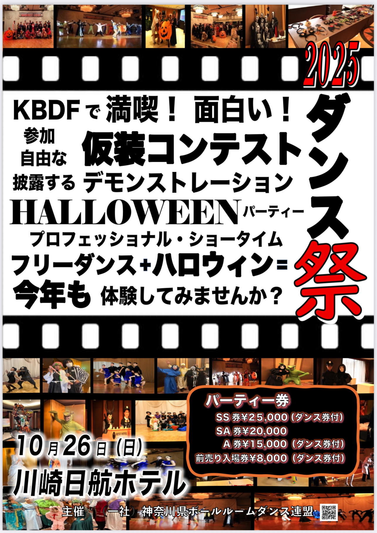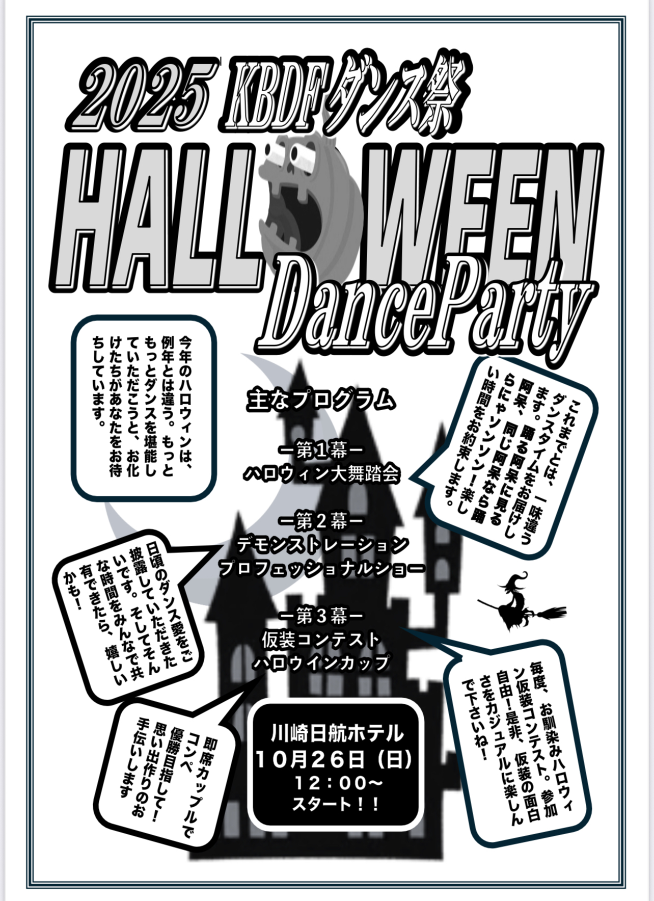 2025 10/26 今年も開催します! 大人気イベント “KBDFダンス祭 Halloween DanceParty” 今年は川崎日航ホテルにて開催! チケットお申し込みはページ下のKBDF登録教室のリンクよりお問い合わせください 仮装でダンス楽しんじゃいましょう! 皆様のお越しを心よりお待ちしております!