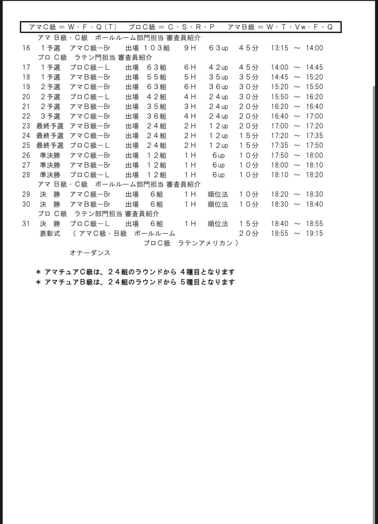 令和7年5月11日(日)大さん橋ホール B級・C級・D級ダンス競技会 E級・ノービスダンス競技会 タイムテーブルです