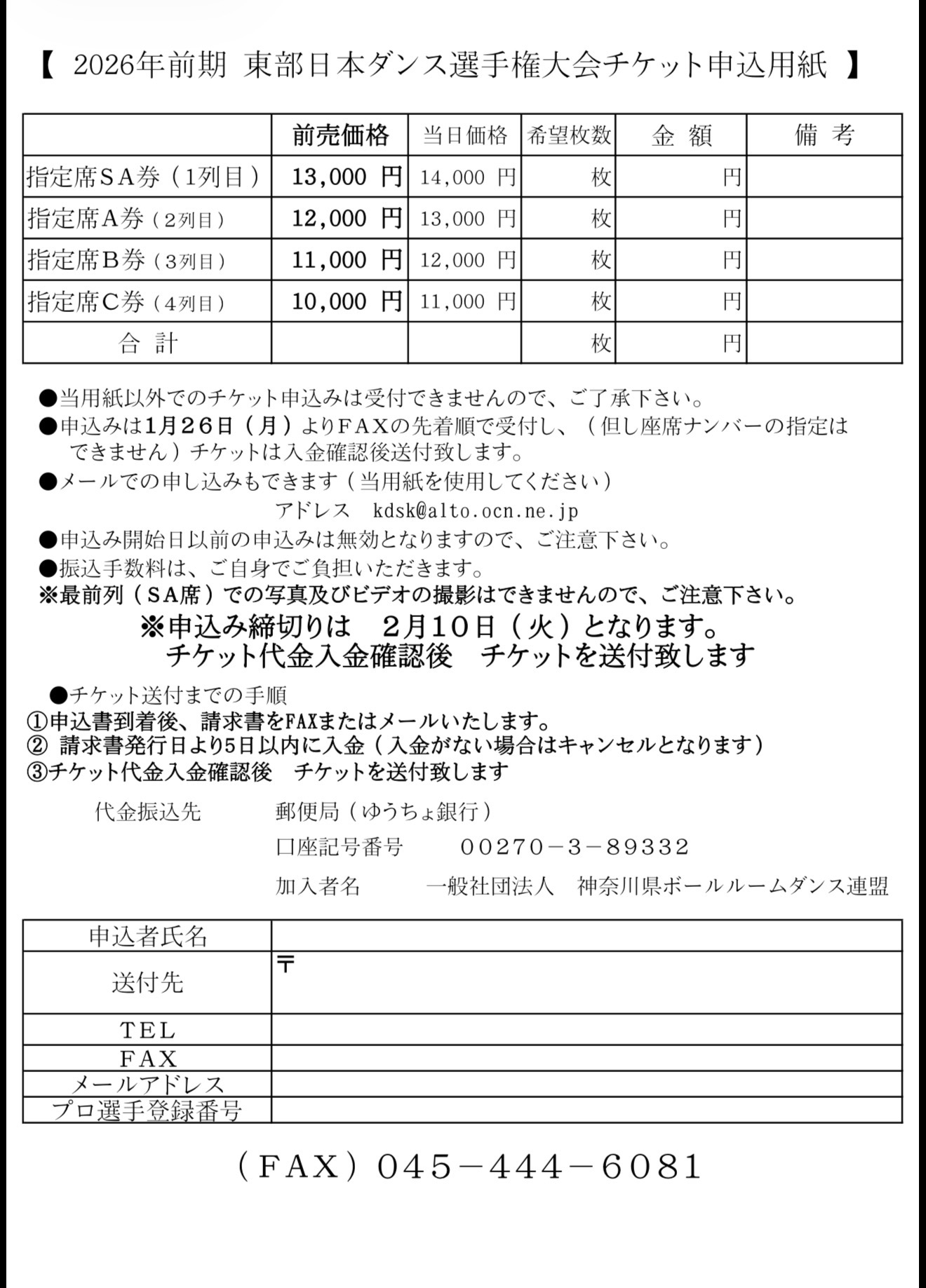 2026 3/8(日に、大さん橋ホールで開催される 東部日本選手権 プロラテン アマボールルームのチケット購入申込書です。 ご確認ください メールアドレスからも申込可能です kdsk@alto.ocn.ne.jp