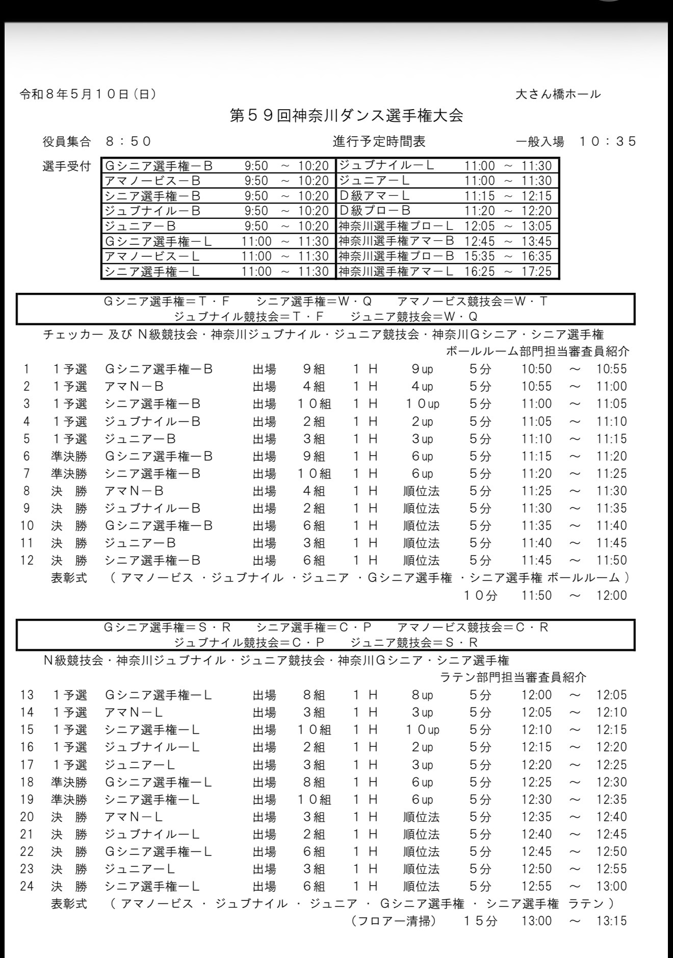 令和7年 5/10(日)大さん橋ホールにて開催の 神奈川選手権と併催競技会のタイムテーブルを掲載いたします ご確認ください